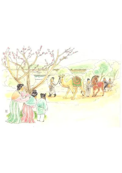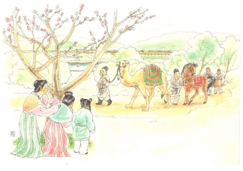 早川和子ポストカード6(新羅から贈られたラクダを見物する飛鳥の人々)