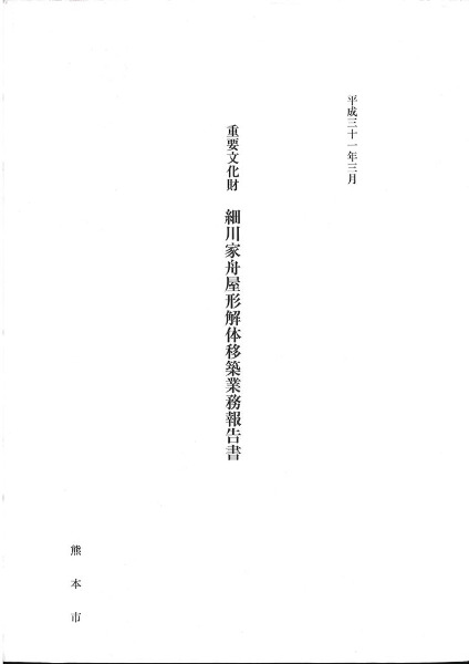 肥後藩主細川氏が参勤交代の際、豊後鶴崎より海路大阪まで乗用した御座船に乗せられていた舟屋形の解体移築報告書。昭和38年の「修理工事報告書」も再録されている。大名家の豪華な室内壁画などを堪能することができる。