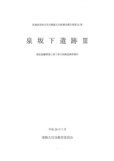 弥生時代中期の再葬墓群が発見された泉坂下遺跡を国史跡にするための確認調査報告書の2冊目。確認された土器棺は、保存目的のため原則検出を行わず、位置などの記録化に留めている。本書で注目すべきは、古代のサメの一種、メガロドン(ムカシオオホホジロザメ)の歯の化石や、サメ類の歯および、それを加工した垂飾に関する分析である。